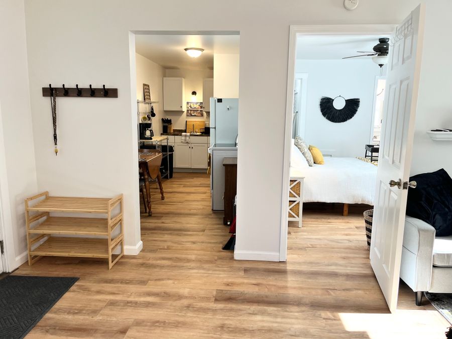 One bedroom ground-level apartment with a separate bedroom and a full bathroom. Kitchen table and chairs in kitchen, oversized chair, and smart TV with a small couch in the living space. Washer and dryer located in the kitchen. Stocked kitchen with common small appliances (no dishwasher), queen-size bed, fast wifi, and all you could need for your stay in Kirksville. 1.1 miles from ATSU / hospital and 0.3 miles from Truman State University. Shared fenced-in area for pets running around.